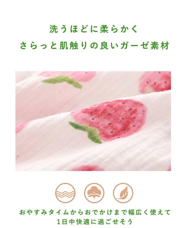 | 総柄が可愛い、ガーゼ素材のシンプルロンパース♪ ロンパース型でおなかが出ないので安心。 前身頃の重なりが深いので成長に合わせて、内側と外側のひもで調節が出来ます。 股下ボタンでオムツ替えも簡単! 洗うほどに柔らかく、さらっと肌触りの良いガーゼ素材なので、おやすみタイムからおでかけまで幅広く使えて、1日中快適に過ごせそう。 | |