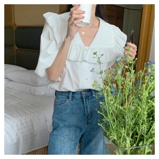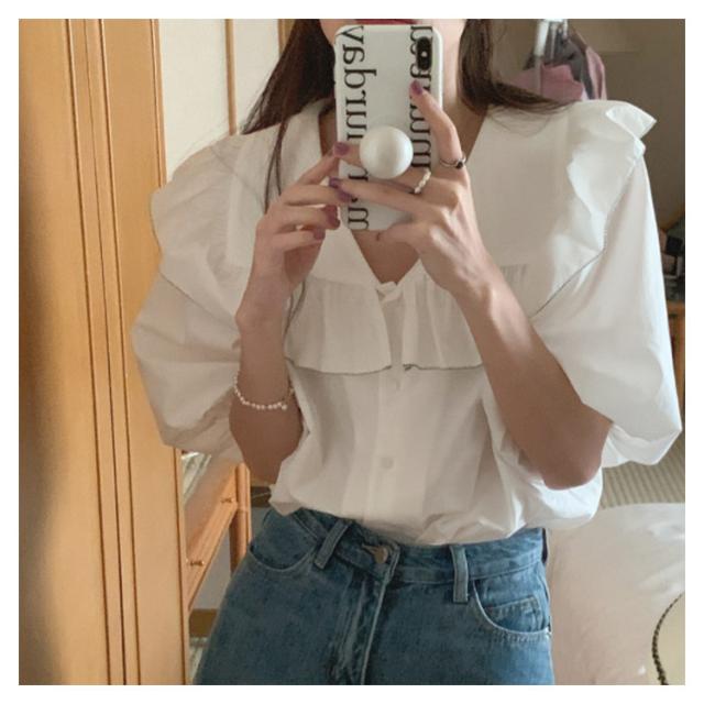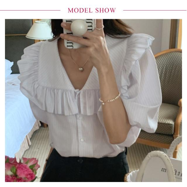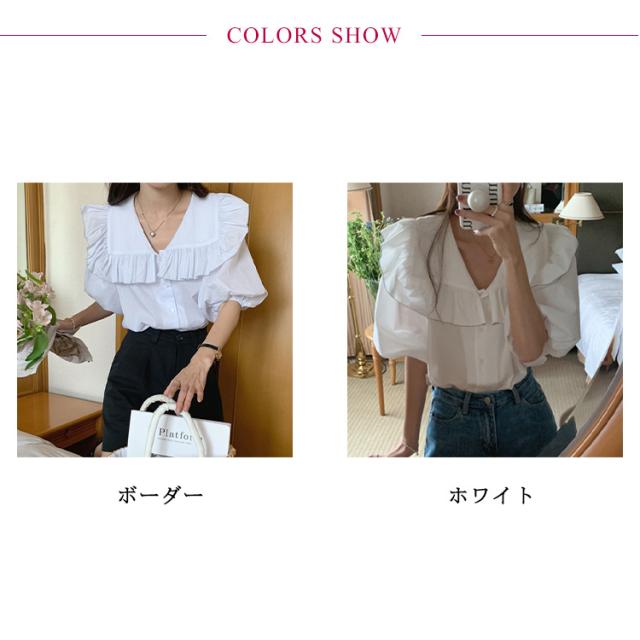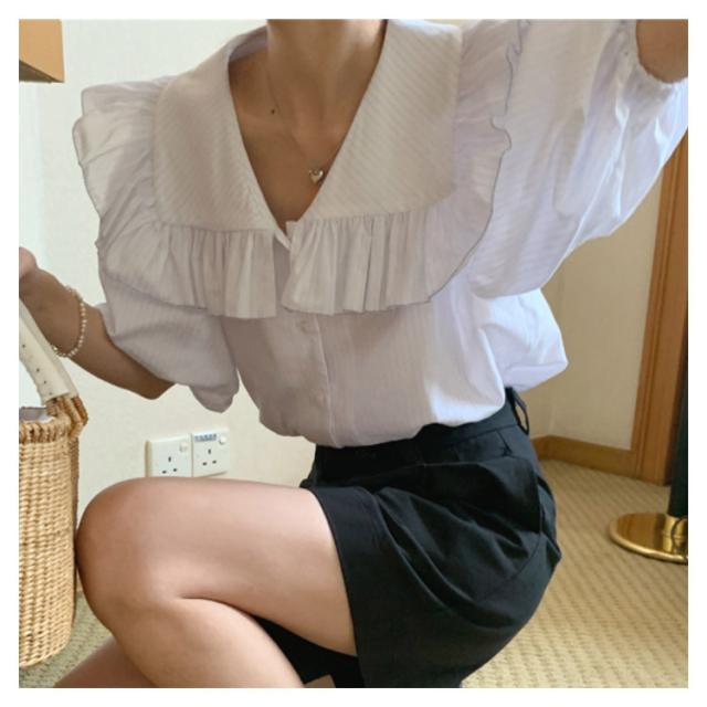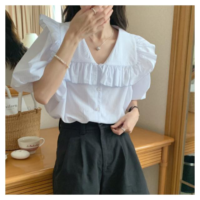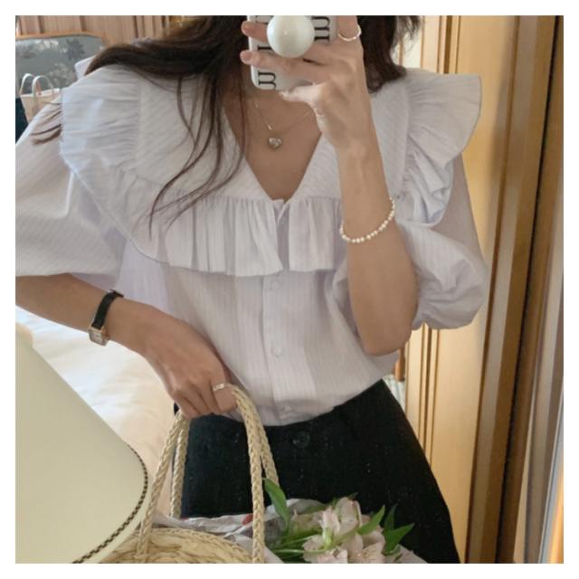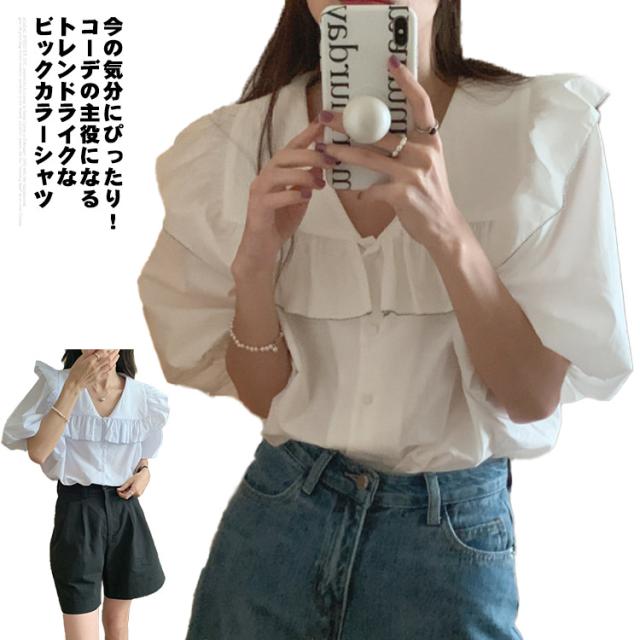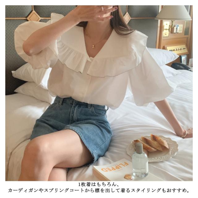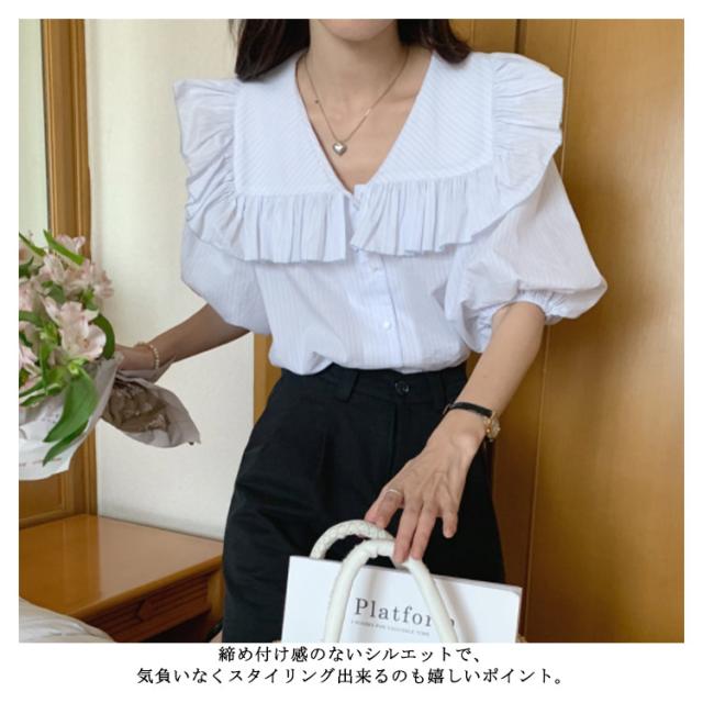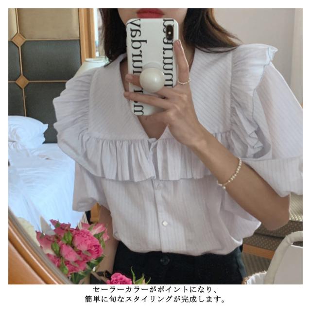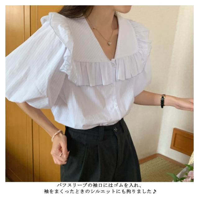送料無料 ビッグカラーブラウス セーラーカラー ブラウス フリル ビッグカラー レディース トップス 春夏 シャツ 半袖 ラッフルカラー ストライプシャツ ボリュームスリーブ ビッグ襟 襟付き フリル ガーリー ホワイト レイヤード