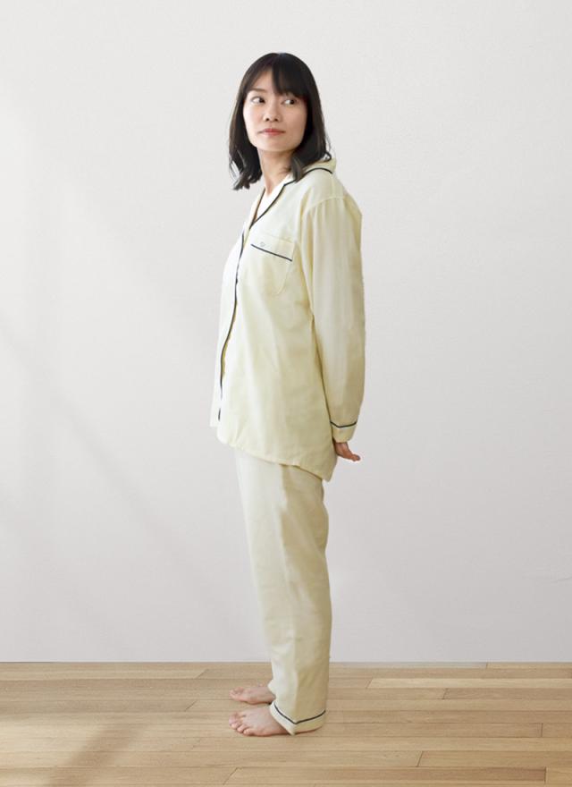 寝る時の姿勢は、通常とは違う部分に重力がかかるため、立っている時と眠る時では体型が異なります。Kaimin Laboのパジャマは寝返りなども考慮し、締めつけられない独自のパターンで立体的に作られています。 |
