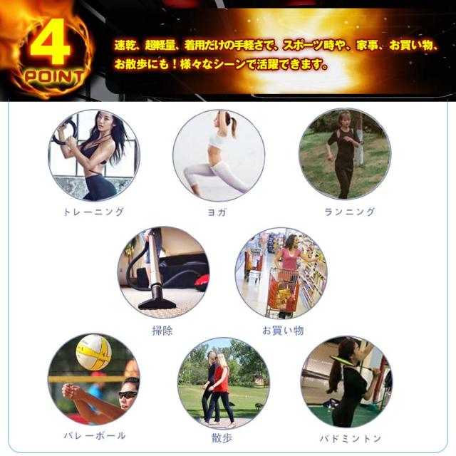●超軽量で、ジョギング、ウォーキング、ヨガ、ホットヨガ、ジム、エアロビ、エアロバイク、サイクリング、ダンス、テニス、家事、お買い物、お散歩など様々なシーンで活躍できます。
