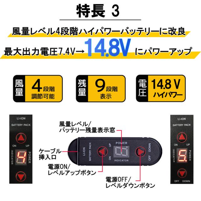 ・約6V、8V、12V、14.8Vの4段階で風量切替が可能です。
