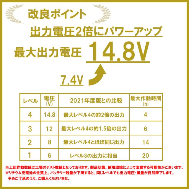 最大出力電圧は旧タイプ(7.4V)→14.8Vに2倍に強化して、風量も格段にアップしております。