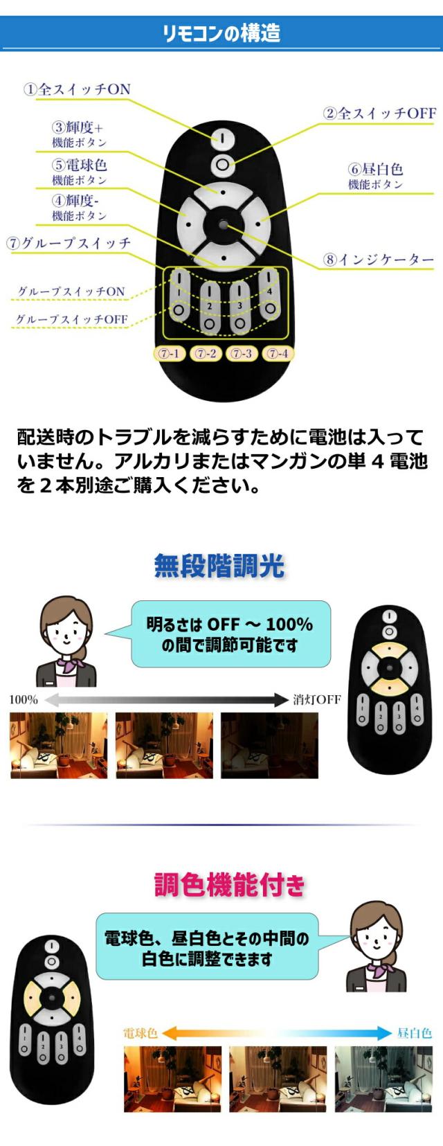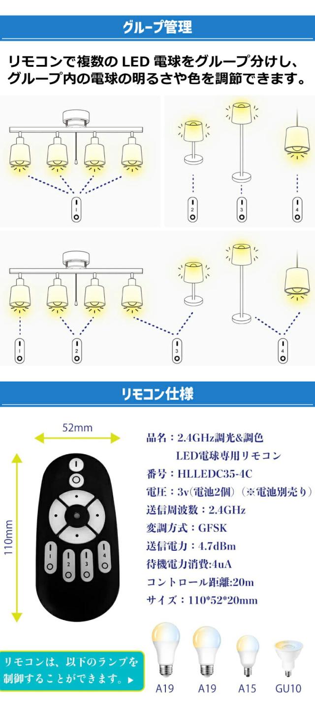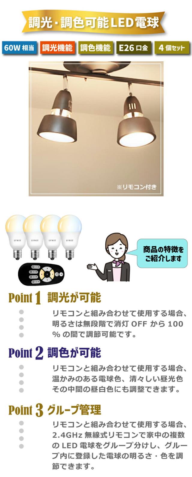 | 商品説明 | LED電球 60w形相当 E26口金 900LM 調光 調色 リモコン付き LEDランプ 消費電力8.3W 遠隔操作 昼光色 昼白色 電球色 常夜灯 広配光タイプ 省エネ 高輝度 3年保証 4個セット(電池別売) |