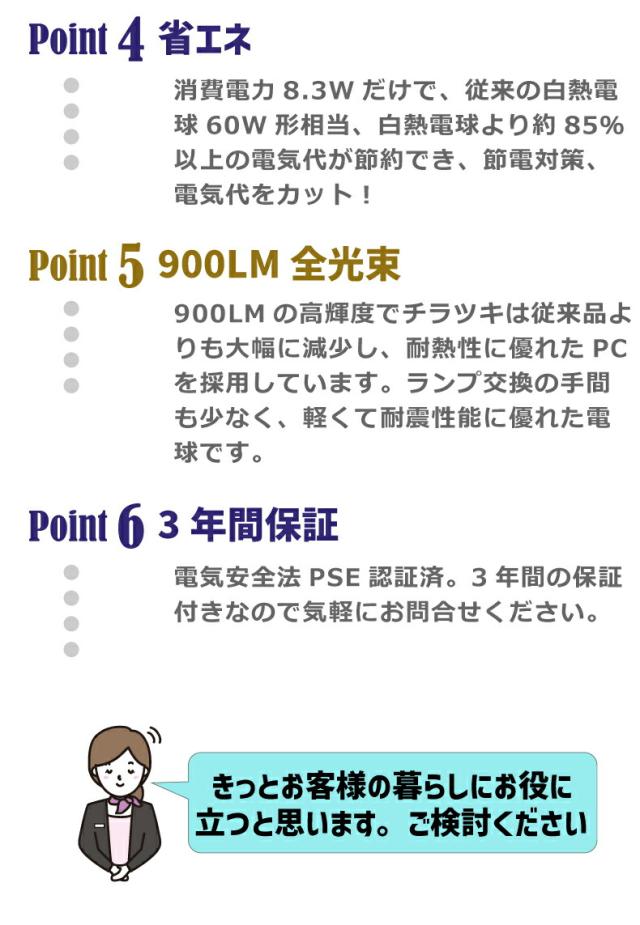 消費電力8.3Wだけで、従来の白熱電球60W形相当。従来の白熱電球より約85%以上の電気代が節約でき、節電対策、電気代カット! 900LMの高輝度で、チラツキは従来品より大幅に減少! 耐熱性に優れたPCを採用していてランプ交換の手間が少なく、軽くて耐震性能に優れています。
