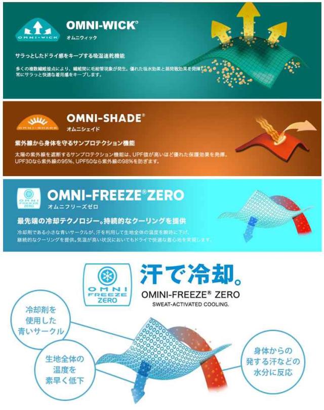 紫外線を98%ブロックする「オムニシェイド UPF50」、汗を利用して温度を下げる「オムニフリーズゼロ」、汗を素早く吸収し乾かす吸汗速乾素材「オムニウィック」を私用しています。(コロンビア独自のテクノロジー)
