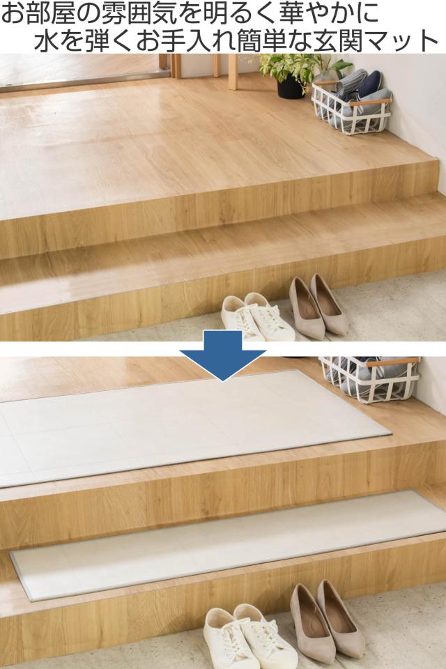表面に防水、撥水効果のある塩化ビニル素材を使用しています。雨の日や濡れた足でもマットに染み込まずに水を弾いてくれます。サッと拭き取るだけなのでお手入れも簡単。きれいな状態を長く保ち、快適な空間を創ります。