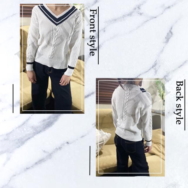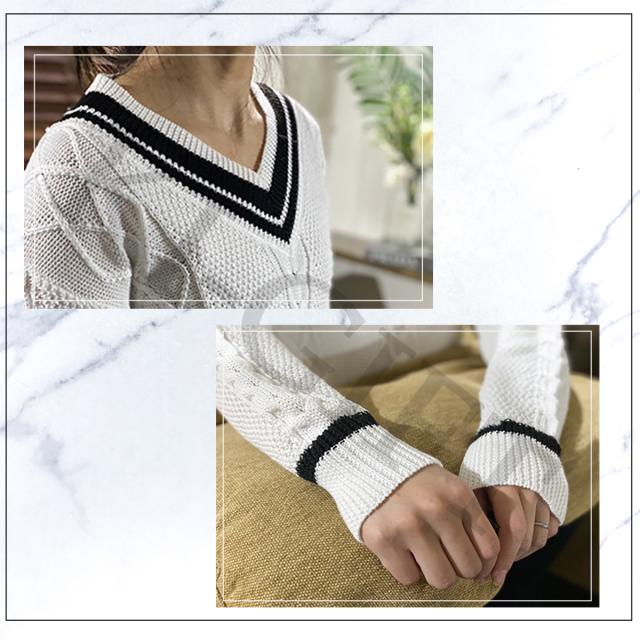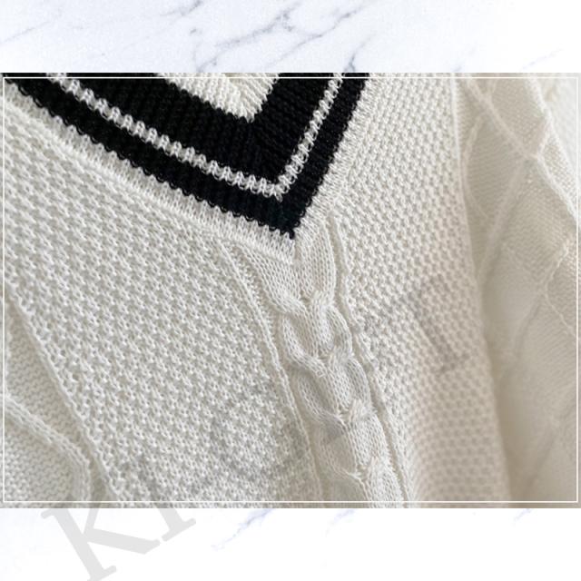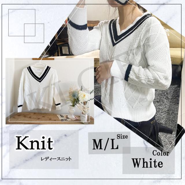 レディース ニット ホワイト M 長袖 Vネック ケーブル編み プルオーバー 無地 シンプル カジュアル 春秋