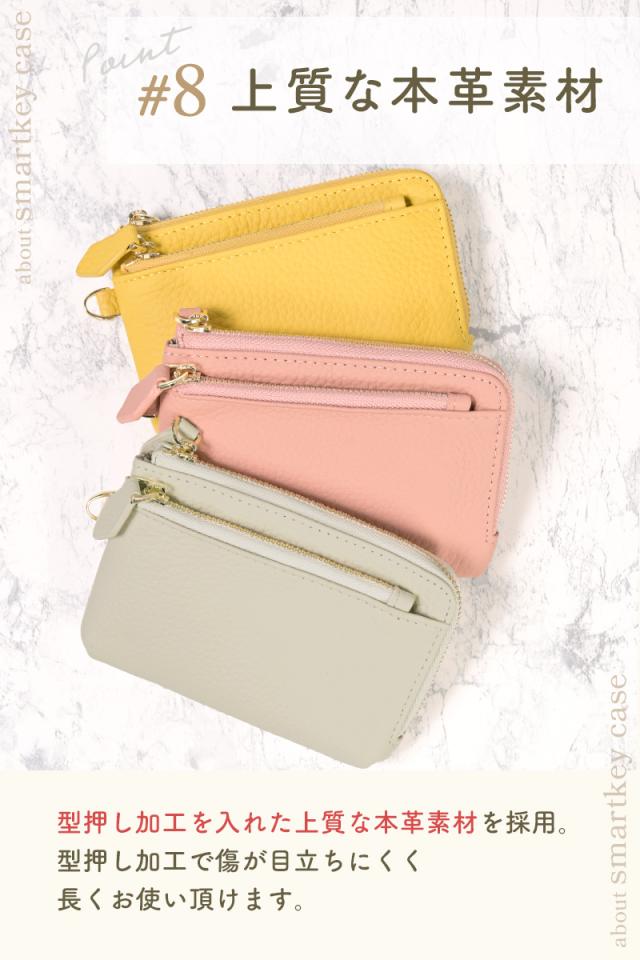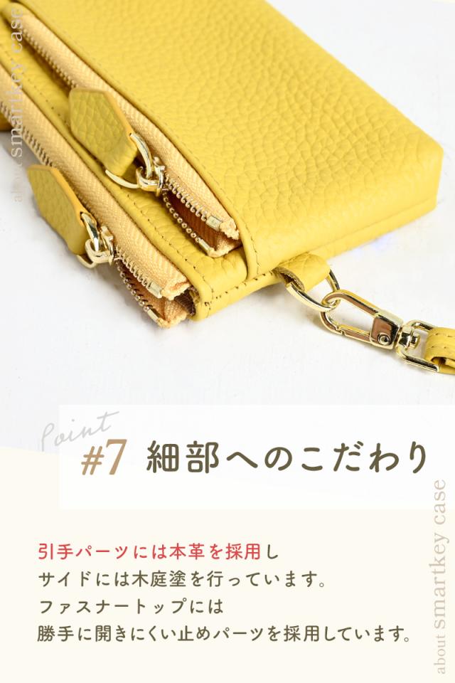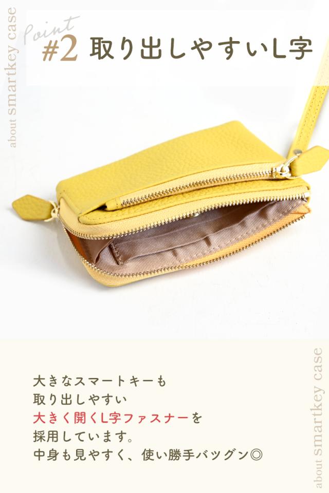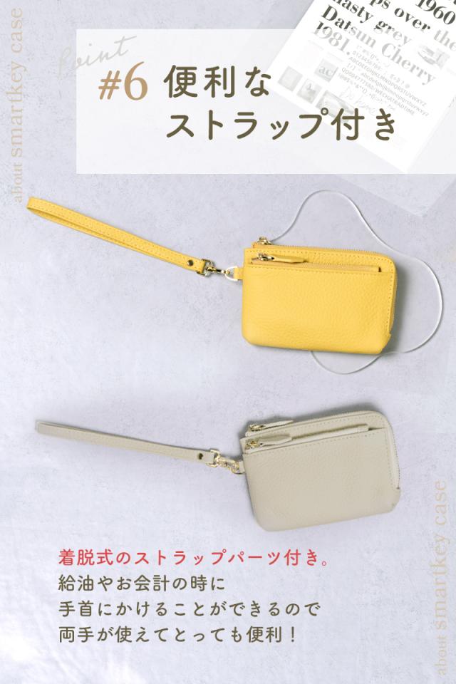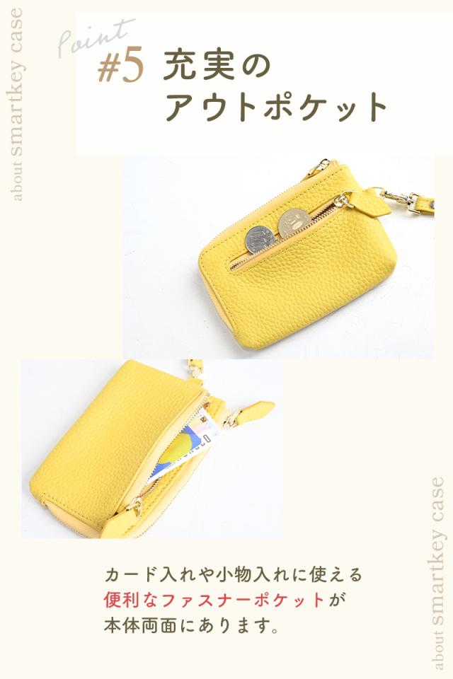 SMARTKEY CASE 6colors スマートキーケース 【スマートキー2個収納可能】 スマートキーを2個収納可能なキーケースです。 丁度良いサイズ感、シンプルな装いで使う人を選ばないミニマルな商品です。 【取り出しやすいL字】 大きなスマートキーも出しやすい、大きく開くL字ファスナーを採用しています。 【内装キーリング】 しっかりホールドできるリングタイプのキーリングを搭載。 【内装収納】 免許証等のカード類を収納できるカードポケットが3か所、 お札は二つ折りで収納が可能です。 【充実のアウトポケット】 カード入れや小銭入れに使える便利なファスナーポケットが本体両面にあります。 【便利なストラップ付】 着脱式のストラップパーツ付きで、給油、お会計時に手首にかけると両手が使えます。 【細部へのこだわり】 引手パーツには本革を採用し、再度には木庭塗を行っています。 ファスナートップには勝手に開きにくい止めパーツを採用しています。 【上質な本革素材】 型押し加工を入れた上質な本革素材を採用、型押し加工で傷が目立ちにくく長くお使い頂けます。 |