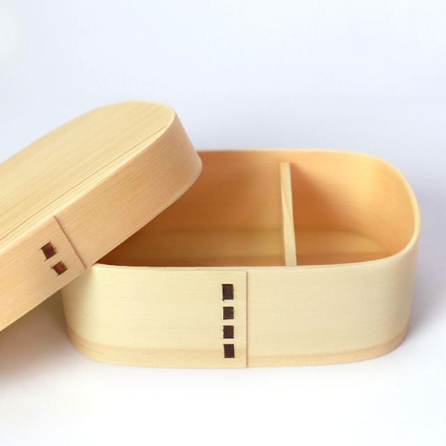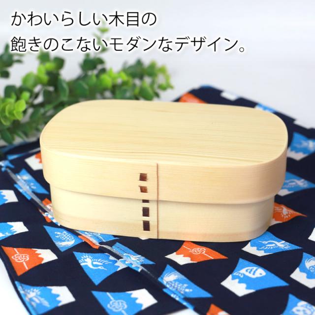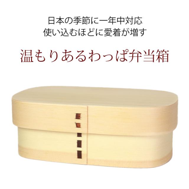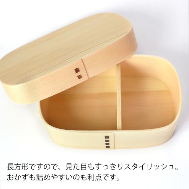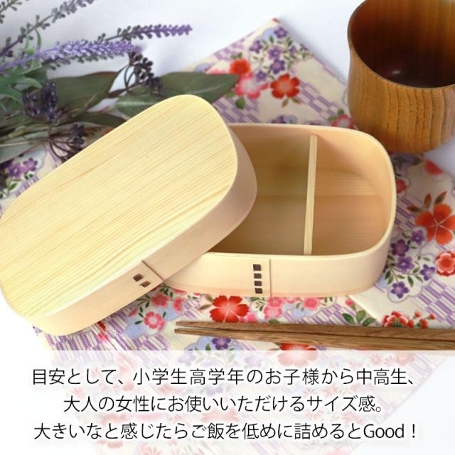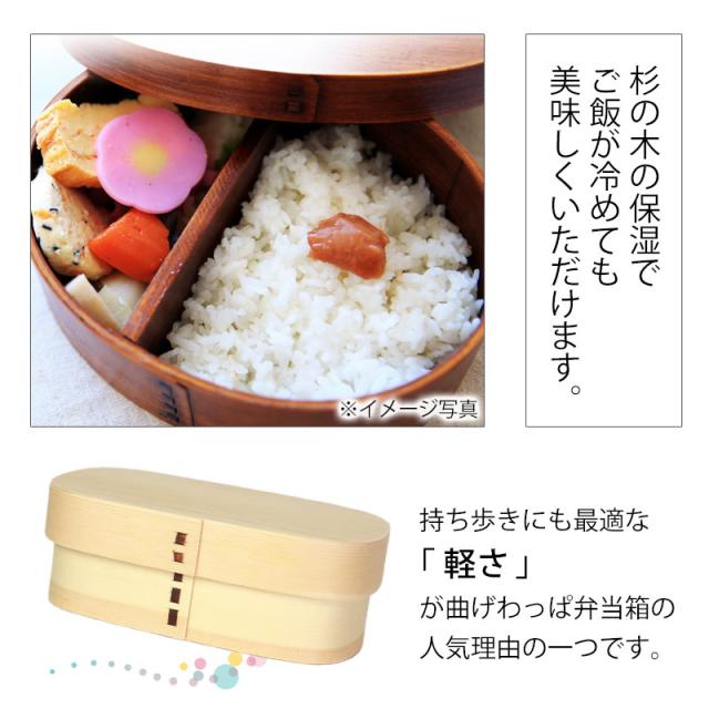 | 商品説明 | お子様や女性向きの小さめサイズのお弁当箱です。 形状は長方形ですので、見た目もすっきりスタイリッシュで、おかずも詰めやすいのも利点です。 曲げわっぱの最大の魅力はお弁当が美味しく食べられることです。 これは木の調湿作用でご飯がベチャっとなりにくく、また通気性が良いのでお弁当の保存に適しているからです。 曲げわっぱは電子レンジ対応していませんが、電子レンジで温めなくても美味しいお弁当が食べられます。 また、食洗機対応ではございませんが、ウレタン塗装を施していますので、手洗いで簡単に洗うことができます。 見て懐かしく、でも、今の時代にはモダンに映る「わっぱ弁当箱」手に取ると、軽くて木の温もりを感じるやさしい気持ちに。 ほのかな木の香りが心地よく、懐かしく温かい気持ちになる使い心地。 日本文化のお弁当を曲げわっぱでおしゃれに普段使いに使っていただければ幸いです。 工芸品が身近にあることで、伝統文化の継承につながればと、ささやかながら願っています。 ご入学、ご就職で、新しい生活がはじまります。お弁当箱も新しくして、新鮮な感覚を楽しんでみませんか。 曲げわっぱ杉の木の調湿作用で、ごはんが冷めてもかたくなりにくく美味しく頂けるのが利点です。 自然素材の木のお弁当箱で、ゆっくりと食べるのも良いものです。 おかず仕切り付き。(仕切りは取り外し可能) |