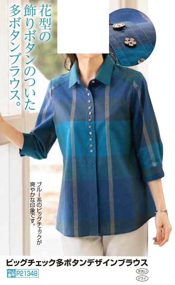ブラウス 春夏 ビッグチェック多ボタンデザインブラウス ブルー系 飾りボタン付きブラウス レディース 婦人服 ミセス シニア 女性 カジュアルシャツ シニアファッション 40代 50代 60代 70代 80代 母の日 お母さん nss p21348