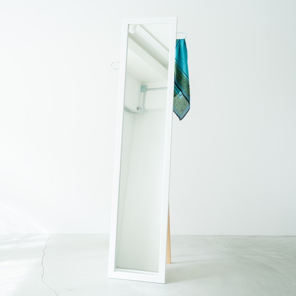 フック付きスタンドミラー(ホワイト/白) 幅35cm 鏡/カガミ/姿見/全身鏡/木製/飛散防止加工/日本製/収納/ラック/ハンガー/北欧風/折りたたみ/SEN-021
