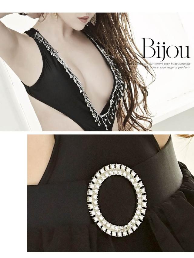 ☆深めVネックからの谷間魅せと煌めくビジューフリンジが海外セレブ感たっぷりなワンピース水着は夏のリゾートで映えること間違い無しのインポート風水着です♪