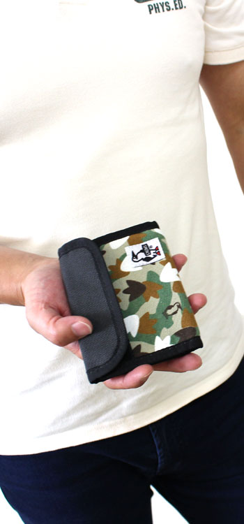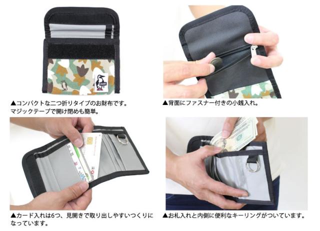 コンパクトな二つ折りタイプのお財布です。マジックテープで開け閉めも簡単。背面にファスナー付きの小銭入れ。