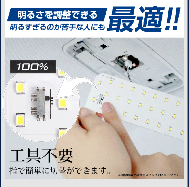 驚異の白さを実現!車種専用設計のLED取付済み新品ユニット! 基盤いっぱいにLEDを配置しているため、純正のLEDより格段に明るい綺麗な純白色。 専用設計のため、ユニットにピッタリ収まっています。 減光調整が付いているため、明るすぎるという方にも安心! 【100%】【70%】【40%】の3段階で切り替え可能! 減光調整は基盤に取り付けたスイッチでの切替となります。 ユアーズのルームランプはただ明るいだけじゃありません。 高演色LED CHIPを使用しているため、まるで太陽光のような鮮やかさで車内を明るく照らします! 取付けにははんだ付けが必要となりますが、カラー写真の取扱説明書が付属するので安心してお取付けいただけます。 |