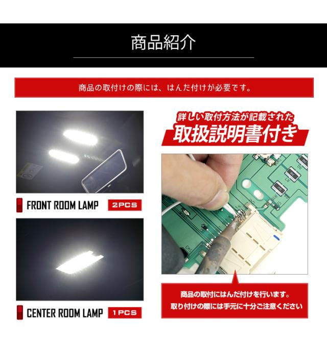 [1]フロントルームランプユニット×2 [2]センタールームランプユニット×1 [3]専用工具×1 [4]取扱説明書 ※本製品はフロント・センター用ユニットの為、ラゲッジは付属しません。 こちらにてLEDラゲッジランプを販売中です。 |