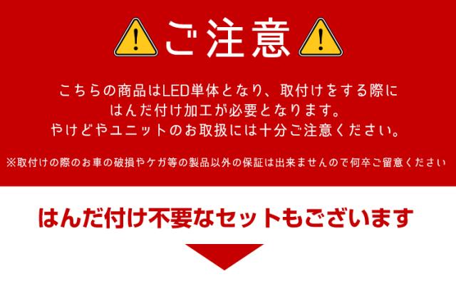 ■この商品はユニットの取付・取り外しが必要になる商品です。 ■この商品はLED単体でのお届けとなるため、はんだ付けの作業が必要となります。 ■長時間の点灯は、ユニットが熱を持つ場合がございます。 ■レンズ/ユニットの傷防止のためにマスキングテープなどで保護してからのご使用をおすすめします。 ■無理にこじ開けると破損の原因となりますので、十分注意してご使用ください。 ■本品またはご使用の際のキズ・破損等に対する保証はございません。ご使用は自己責任にてお願い致します。 |