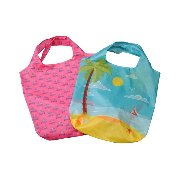 “一面にビートルがプリントされたピンク色のバッグ""と“海とヤシの木をバックにキャンパーバスのフロントがプリントされたバッグ""