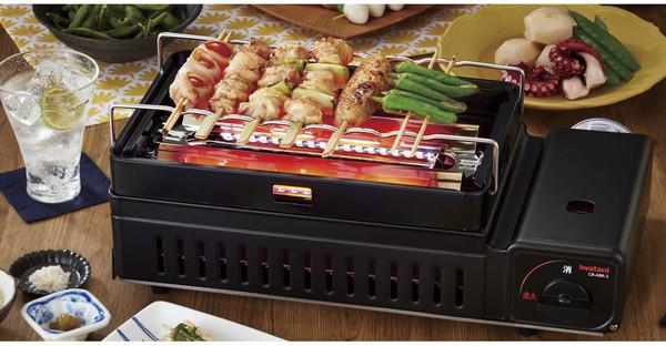 ●2.3kW(2,000kcal/h)●ガス消費量:約169g/h●連続燃焼時間:約90分●点火方式:圧電点火方式●焼網サイズ:約280×180●直火を使わず赤熱させた輻射板の熱で焼くのでムラ なくじっくり焼けます。●強火から弱火まで無段階の火力調節が可能で食材 にあわせた焼き方ができます。●網を外してステーを立てれば串焼きもできます。 ●蓋を外してステーを立てれば串焼きもできます。
