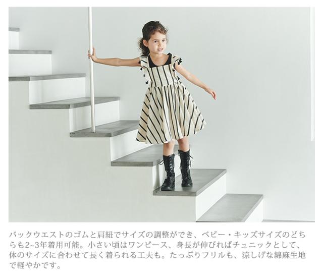 小さい頃はワンピース、身長が伸びればチュニックとして、体のサイズに合わせて長く着られる工夫も。たっぷりフリルも、涼しげな綿麻生地で軽やかです。