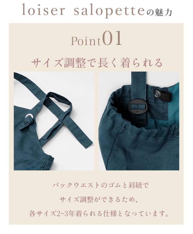 【特徴】バックウエストのゴムと肩紐でサイズ調整ができるため、各サイズ2〜3年着られる仕様となっています。