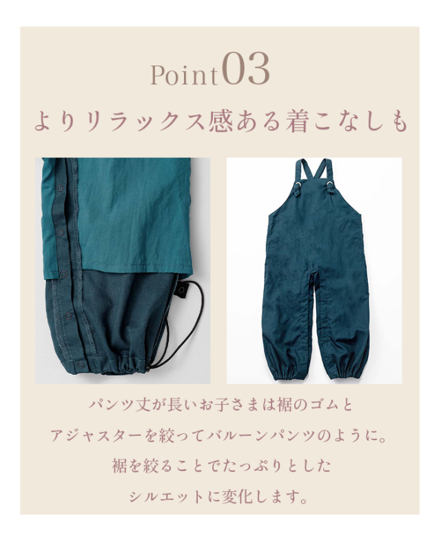 パンツ丈が長いお子さまは裾のゴムとアジャスターを絞ってバルーンパンツのように。裾を絞ることでたっぷりとしたシルエットに変化するため、よりリラックス感がある着こなしも楽しめます。