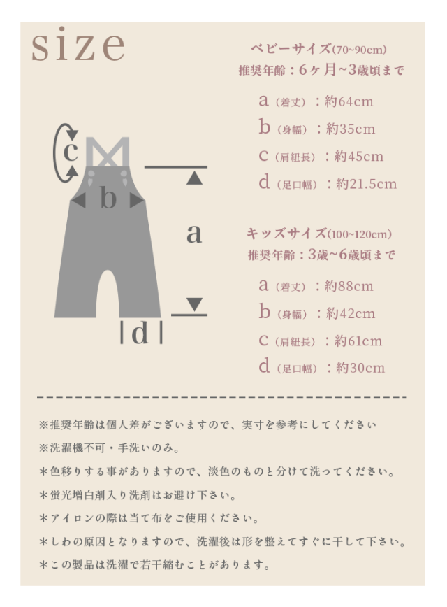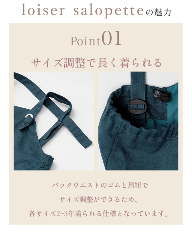 【特徴】バックウエストのゴムと肩紐でサイズ調整ができるため、各サイズ2〜3年着られる仕様となっています。
