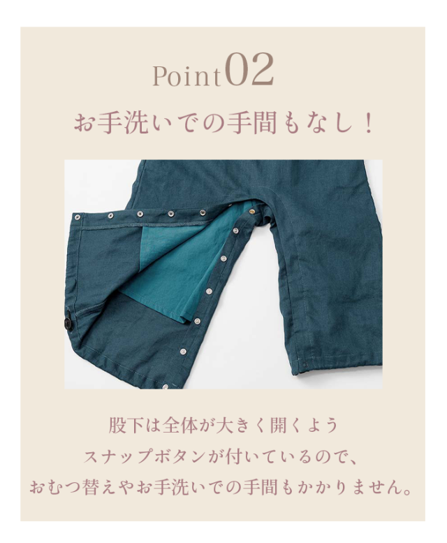 股下は全体が大きく開くようスナップボタンも付属。おむつ替えやお手洗いでの手間もかかりません。サロペットならではの煩わしさも解決しました。