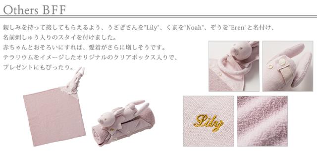 大きくなったら、バッグに付けても◎親しみを持って接してもらえるよう、うさぎさんをLily、くまをNoah、ぞうをErenと名付け、名前刺繍入りのスタイ(人形用)を付けました。
