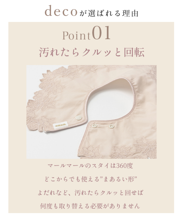 【特徴】マールマールのよだれかけは、360度どこからでも使える“まあるい形”。