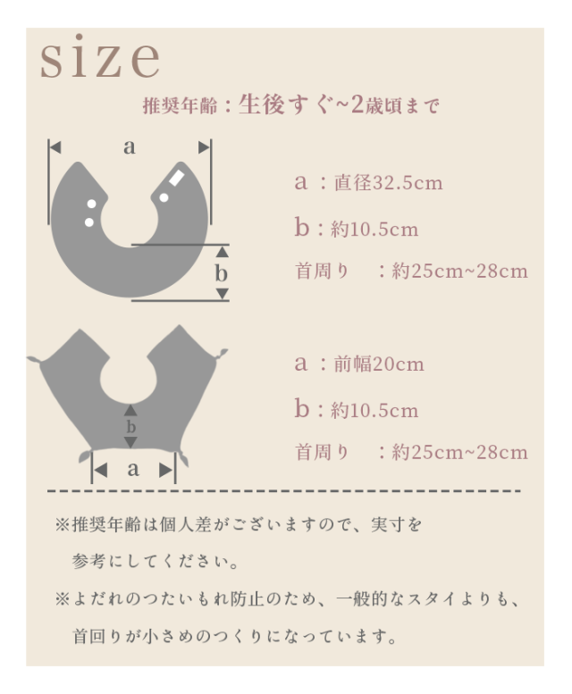 【サイズ】(直径)32.5cm (首周り)約25〜28cm ※シリーズにより、大きさが異なる場合があります。よだれのつたいもれ防止のため、一般的なスタイよりも、首回りが小さめのつくりになっています。