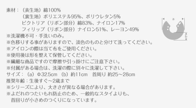 【サイズ】(直径)32.5cm (首周り)約25〜28cm ※シリーズにより、大きさが異なる場合があります。よだれのつたいもれ防止のため、一般的なスタイよりも、首回りが小さめのつくりになっています。