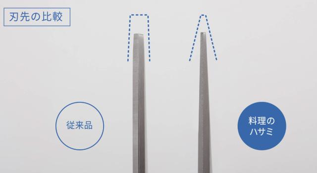 刃先にいくにつれ細く薄くなっていく「先薄刃」は、食材のすき間に入り込み、従来のハサミでは切りにくい部分にも使いやすい形状になっています。