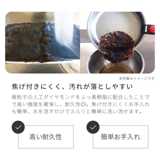 微細粒子の人工ダイヤモンドをふっ素樹脂に配合した磨耗に強いコーティングが施されているので、耐久性が高く、長持ちします。さらに、焦げ付きにくく、お手入れが簡単です。