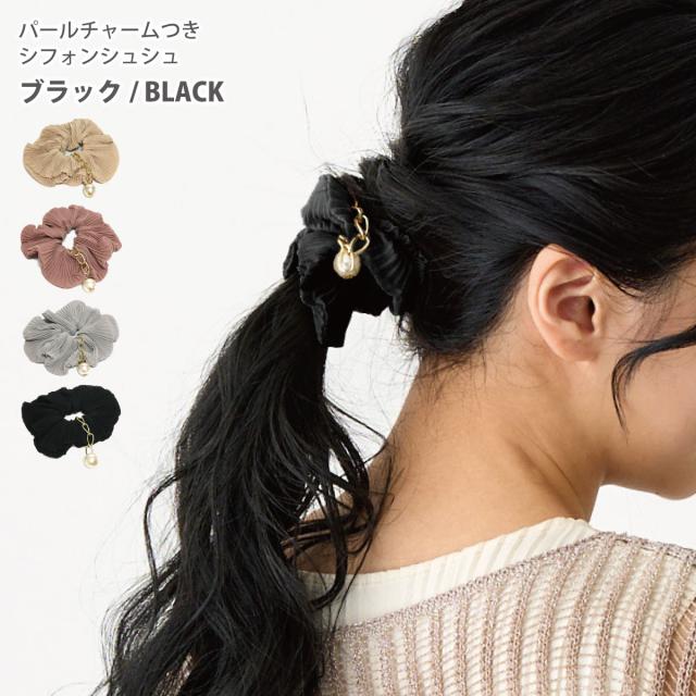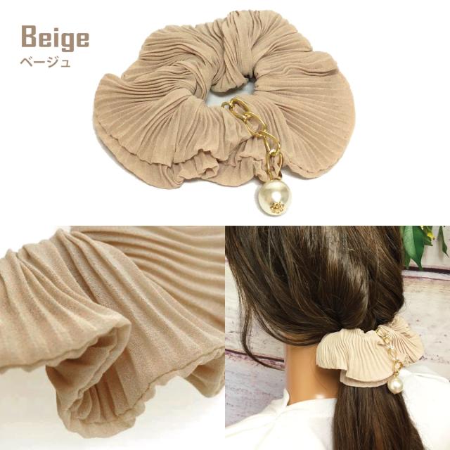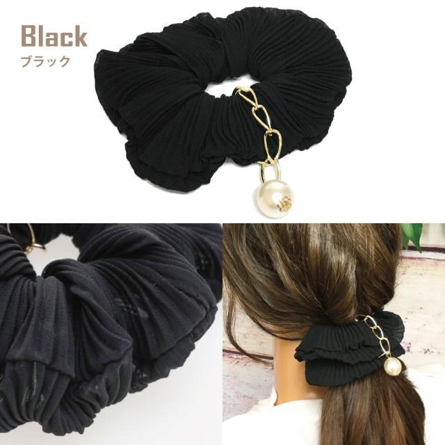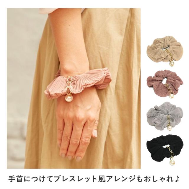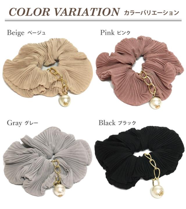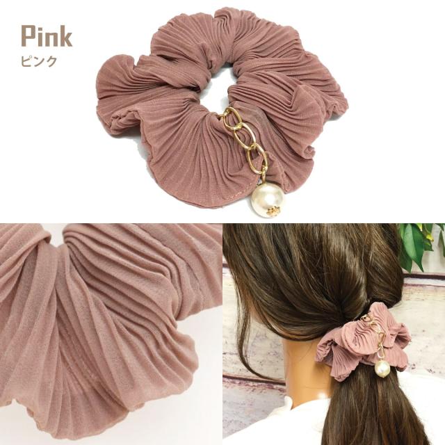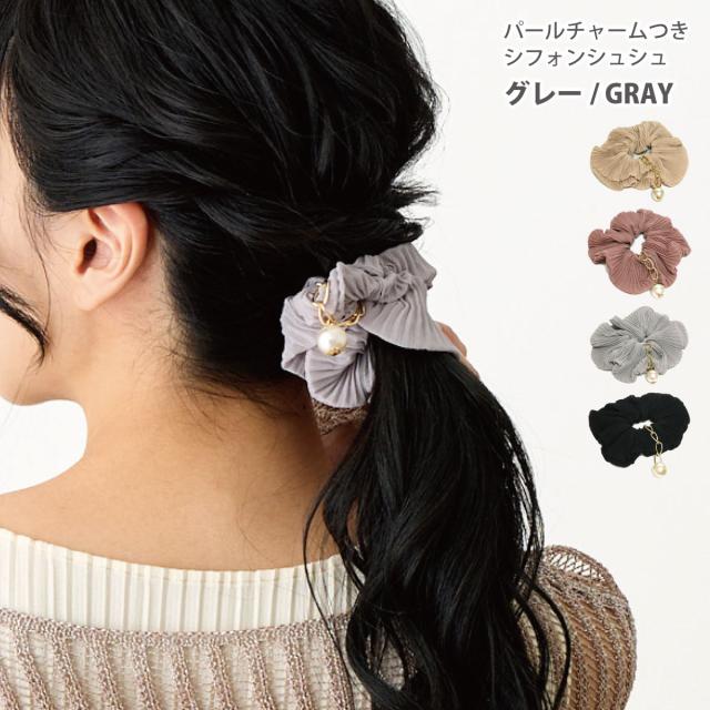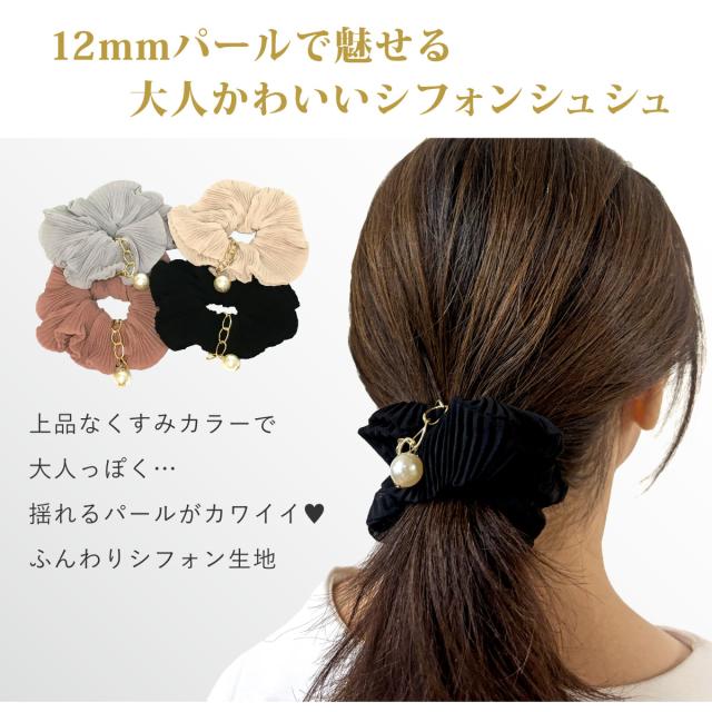シュシュ パール チャーム付き シフォン生地 プリーツ 可愛い ヘアアクセサリー くすみカラー シンプル ha-469 メール便は送料無料 レディース 髪型 アレンジ 髪 多い ボリューム まとめ髪 きれい お洒落 大人 女性 プレゼント