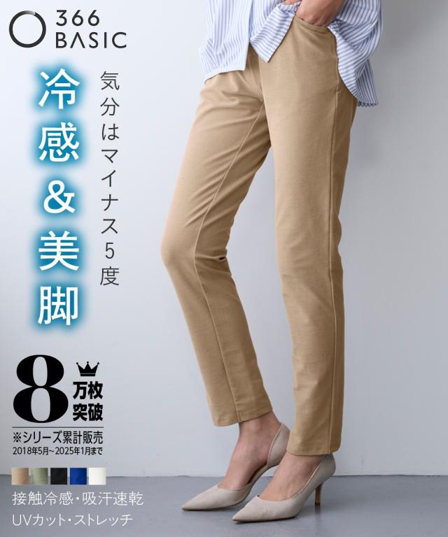 大人気のひんやりカットソーボトムシリーズからご好評にお答えしてさらに進化して新登場☆表は上質感のあるツイル調のカットソー、裏は接触冷感加工を施したダブルフェイス素材を使用。360度ストレッチ素材でしっかり伸びて、ウエストは総ゴムでラクチンで内ひも付きのずれ落ちにくい仕様になっています。夏の大敵、紫外線もカットするからデイリーに使いたくなること間違いなし フィットしすぎず、太すぎないスリムストレートシルエットも魅力。
