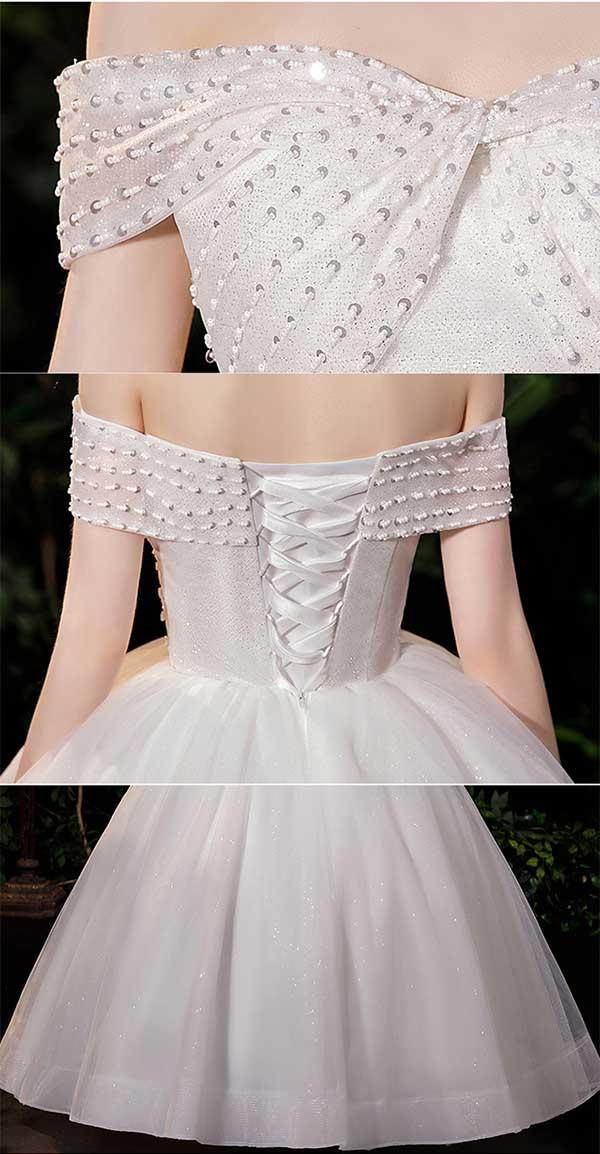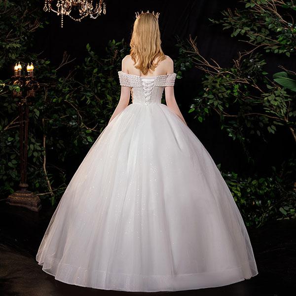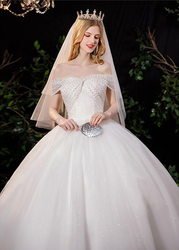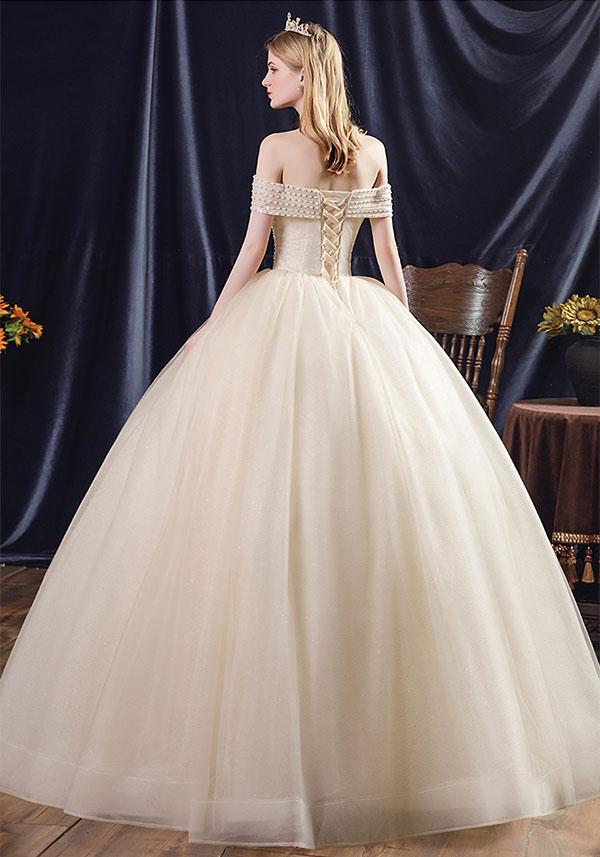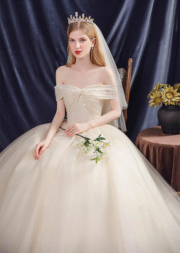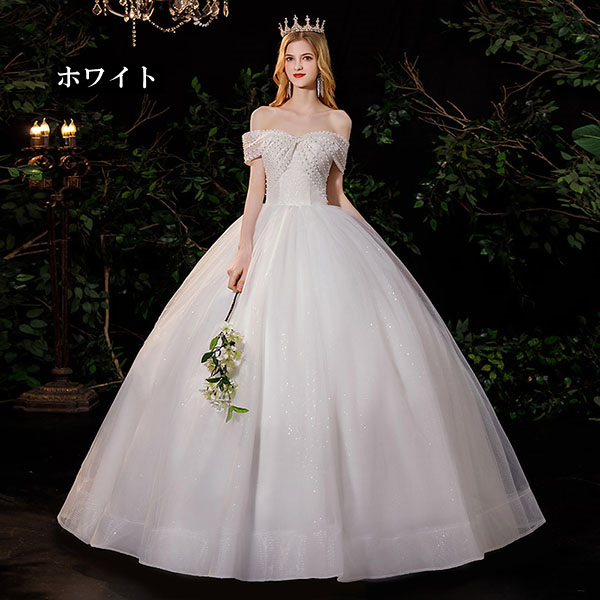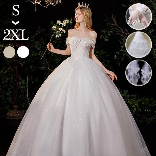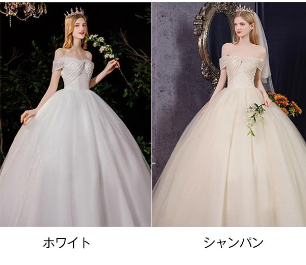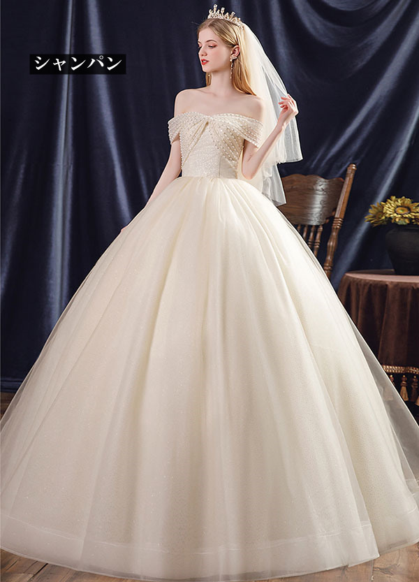 花嫁 ウェディングドレス オフショルダー Aライン 袖あり オフショルダー リボン 白ドレス ワンピース プリンセス 結婚式 二次会 披露宴 前撮り 後撮り 撮影用 フォトウェディング 小さいサイズ ロング エレガント 優雅 シャンパン dp045t2t2l9