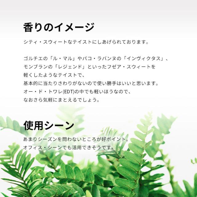 ゴルチエの「ル・マル」やパコ・ラバンヌの「インヴィクタス」、モンブランの「レジェンド」といったフゼア・スウィートを軽くしたようなテイストで、基本的に当たりさわりがないので使い勝手はいいと思います。