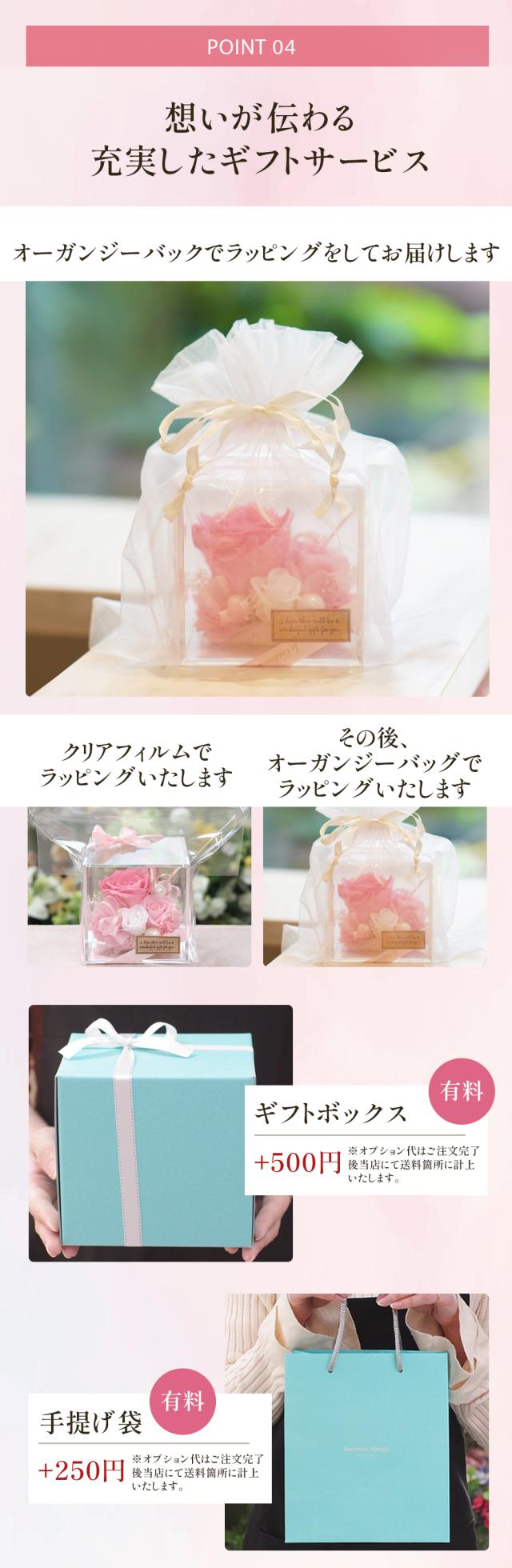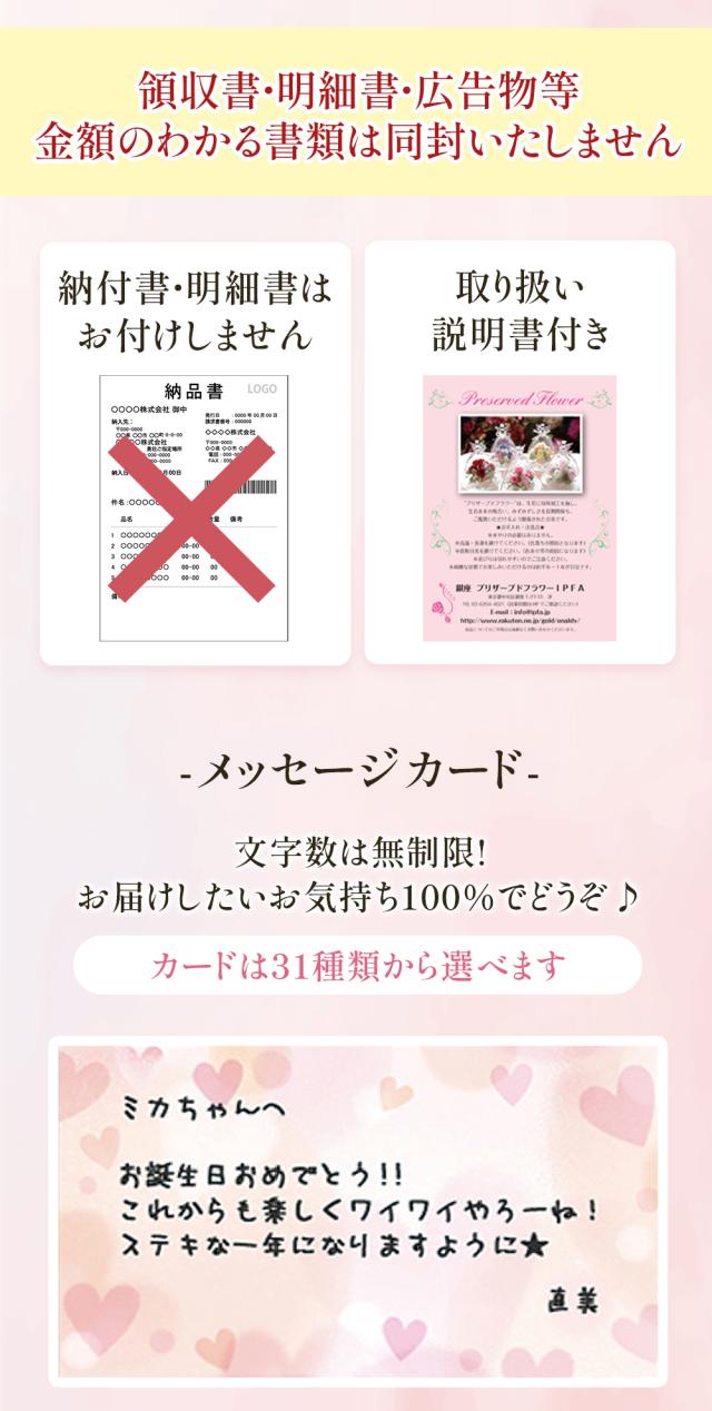 プリザーブドフラワーの取扱説明書、メッセージカード(希望者のみ)、手提げギフトバッグ(購入者のみ)