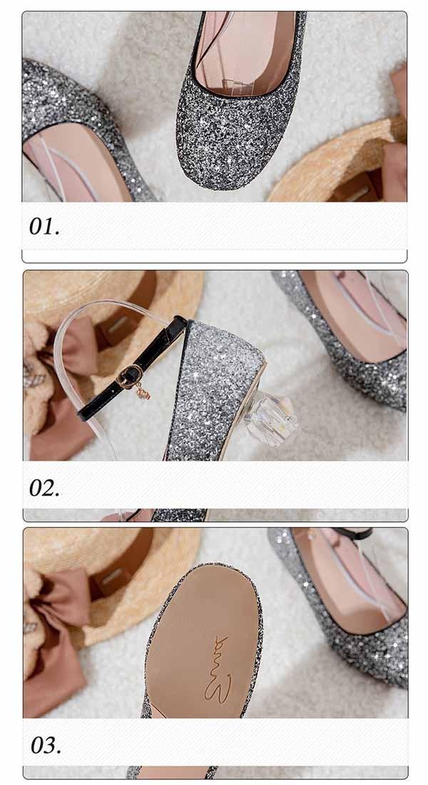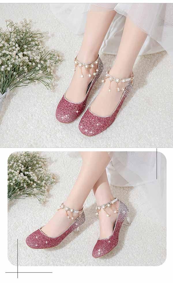 パンプス キラキラ ヒール4.5cm 太いヒール チャンキーヒール アーモンドトゥ アンクルストラップ 上品 ゴージャス 結婚式 ピアノ 発表会 綺麗め パーティー シューズ 女の子 靴 イベント 謝恩会 演奏会 演出 小さいサイズ 20.0〜24.5 ピンク