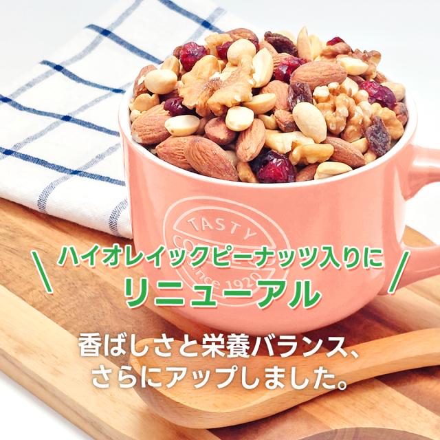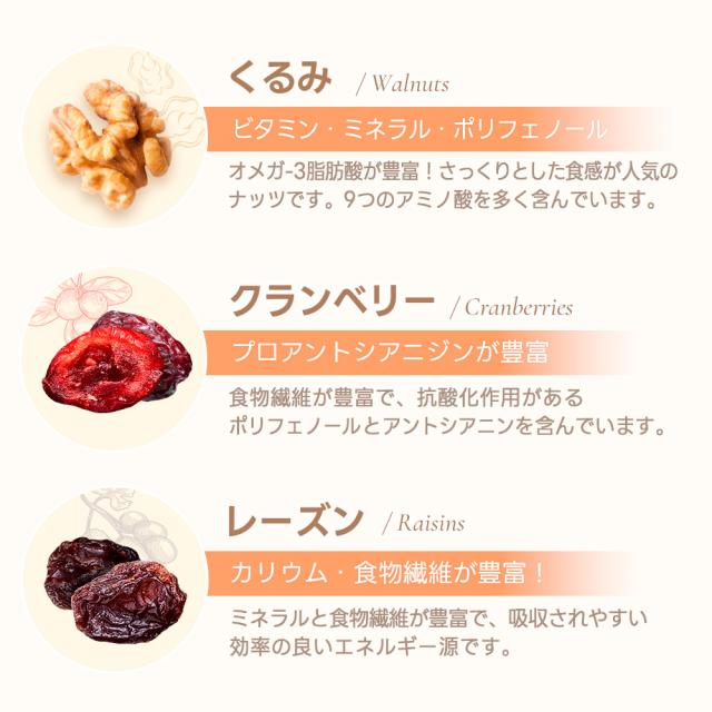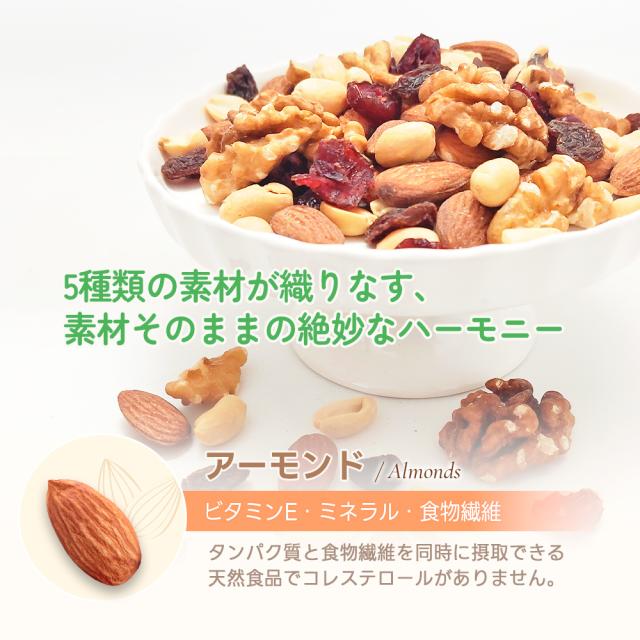 | 原材料名 | アーモンド(アメリカ産) 、くるみ 、落花生、レーズン(レーズン 、食物油脂)、乾燥クランベリー(クランベリー 、砂糖、食物油脂) (アーモンドと落花生は焙煎。くるみは生。) |