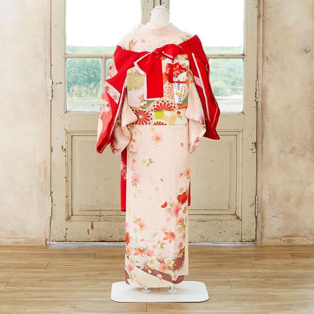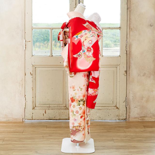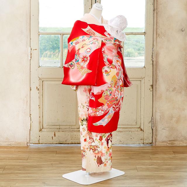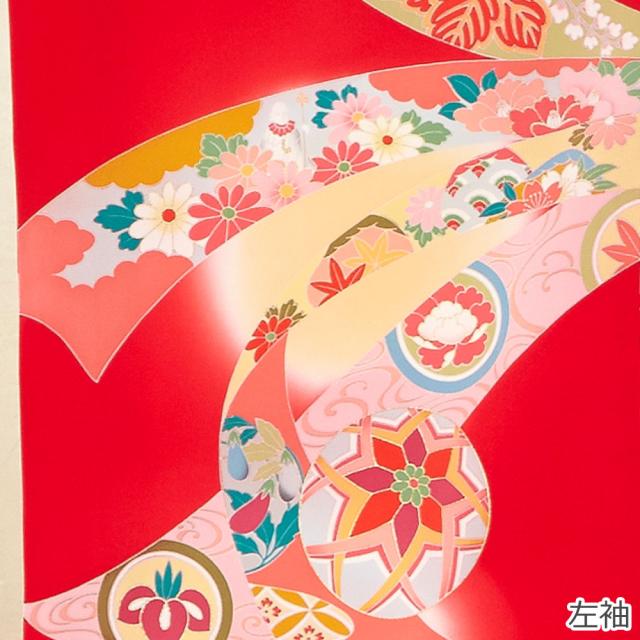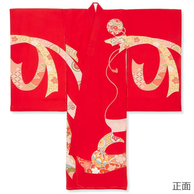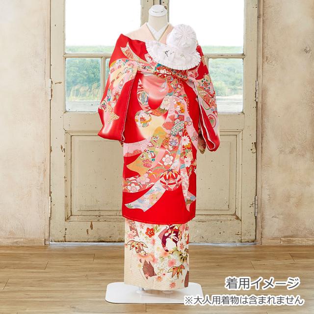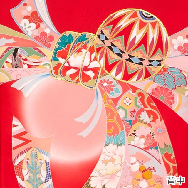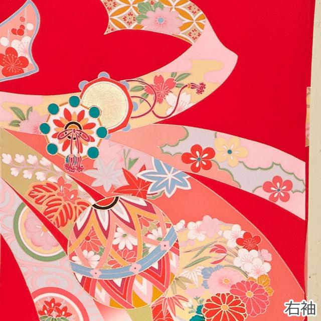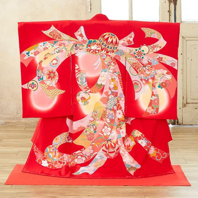 定番の赤い着物に、縁起の良い毬・梅・束ね熨斗などの柄をあしらった華やかなデザインです。