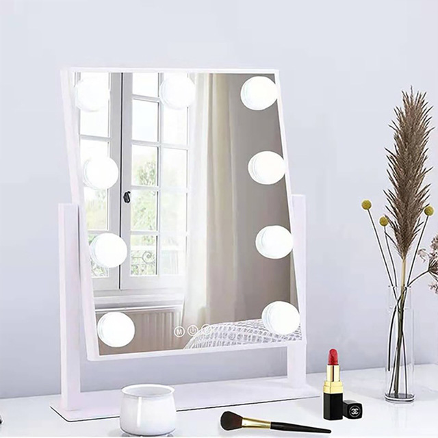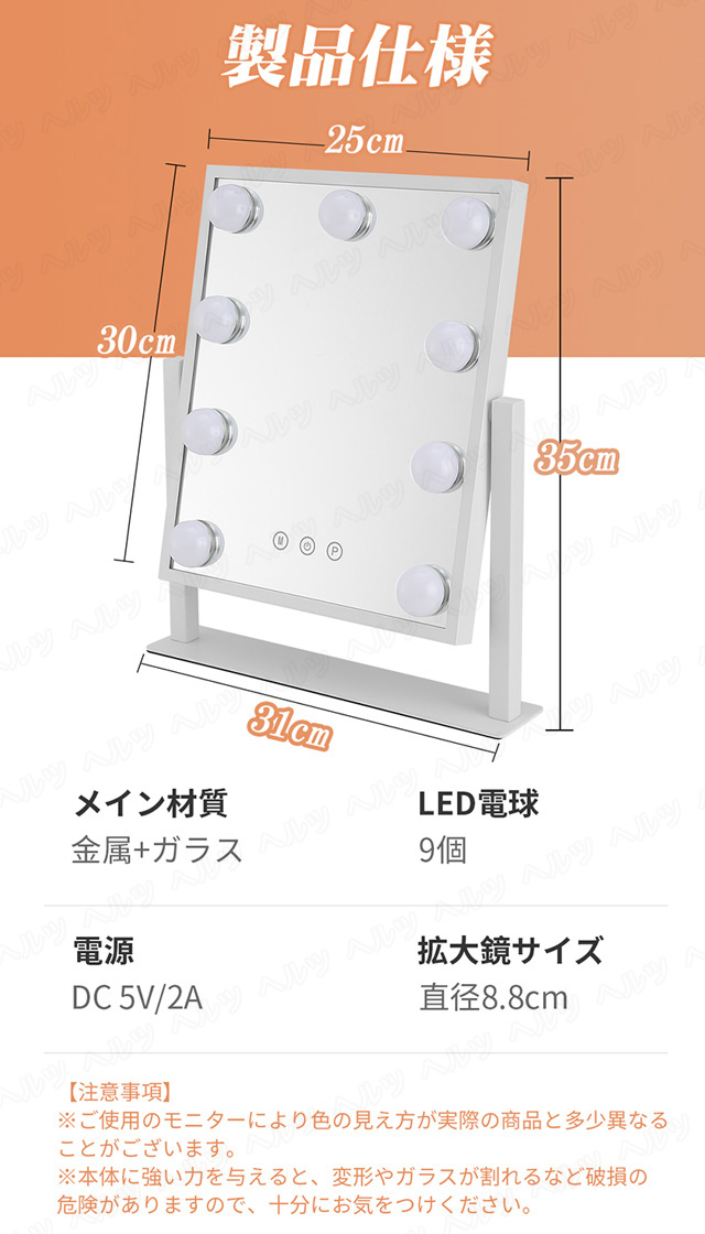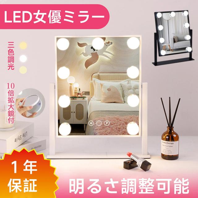 「クーポン配布中」「即納」女優ミラー 大型鏡 ハリウッドミラー 化粧鏡 電球付きミラー 9個LED電球付き スタンドミラー 3色照明モード 明るさ無段階調節 メイクミラー 卓上ミラー 360度回転 10倍拡大鏡付 25cm x 30cm USB給電 娘 彼女 お誕生日 母の日 クリスマス プレゼント