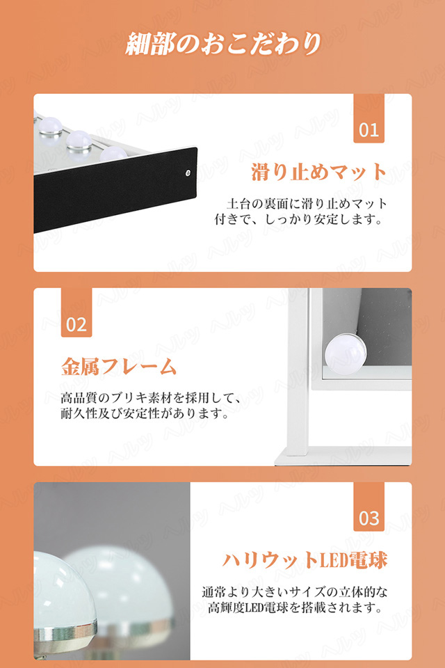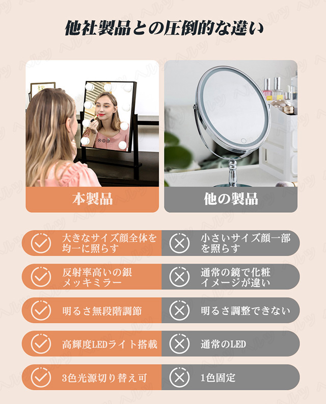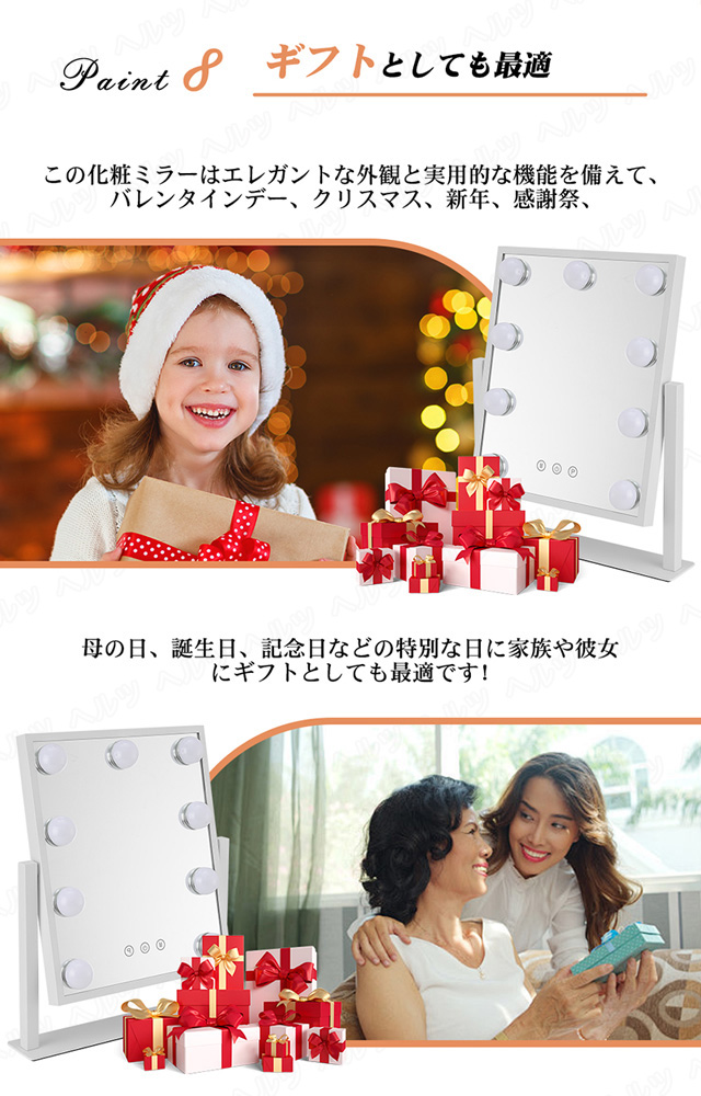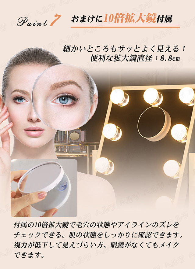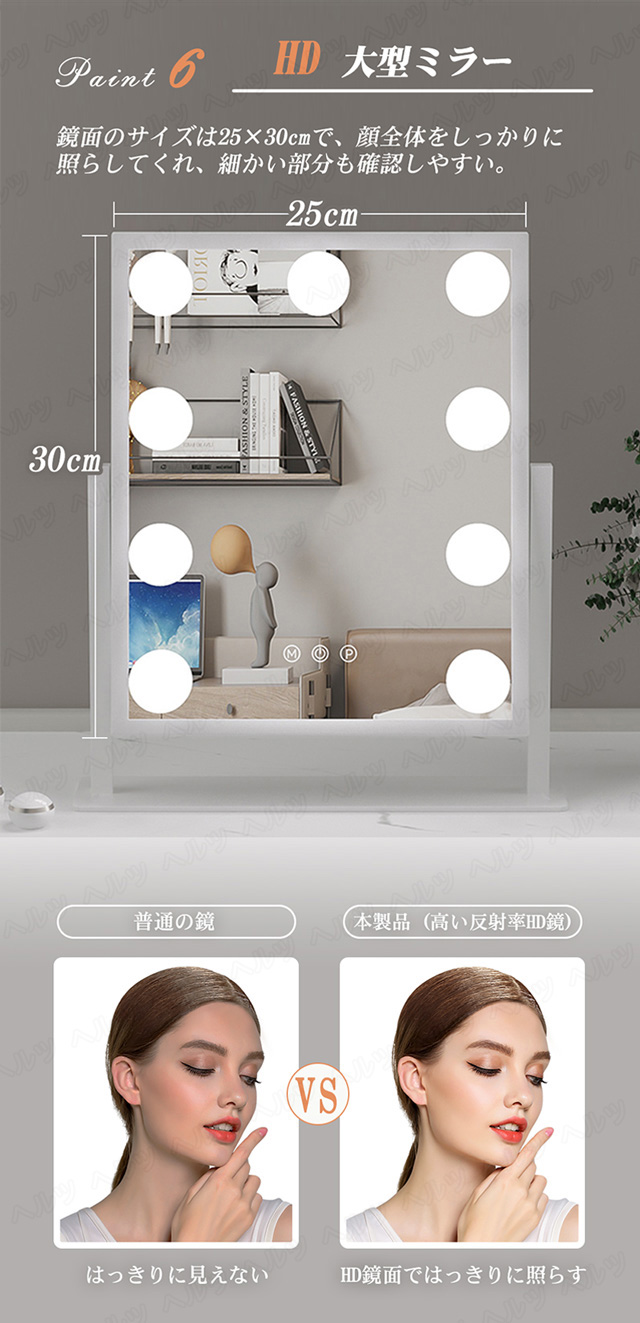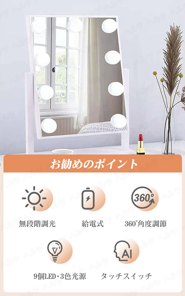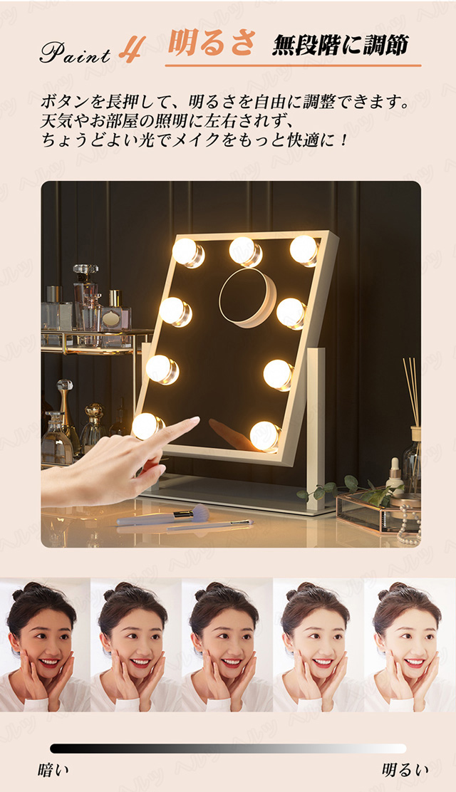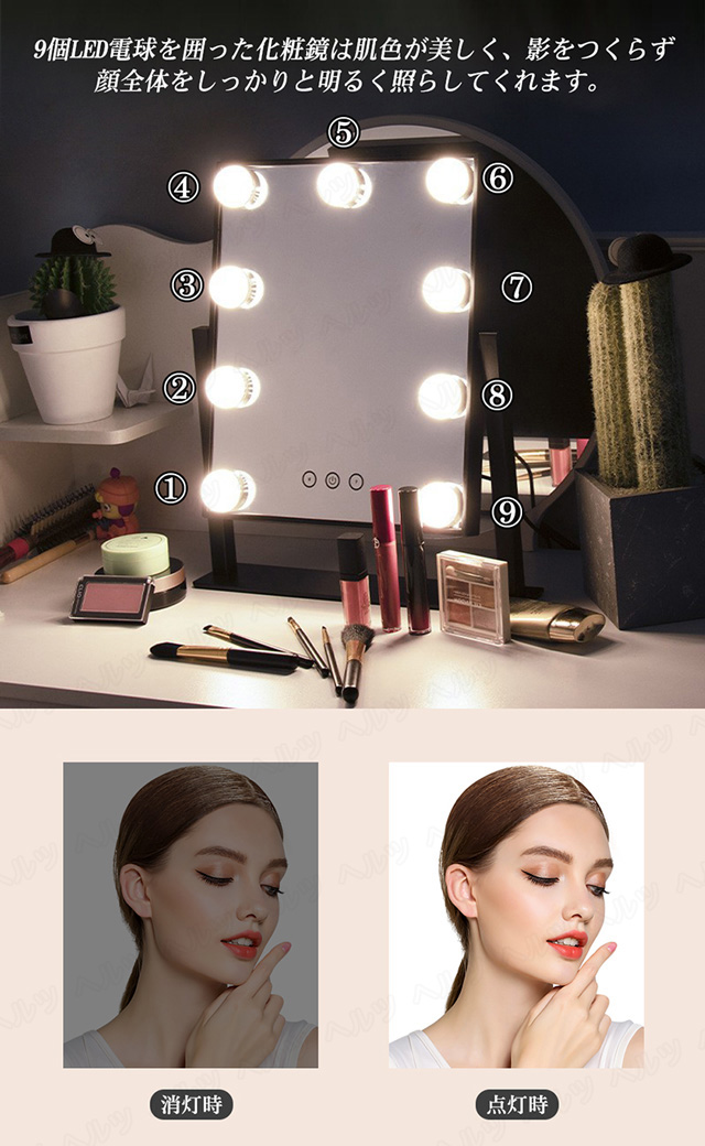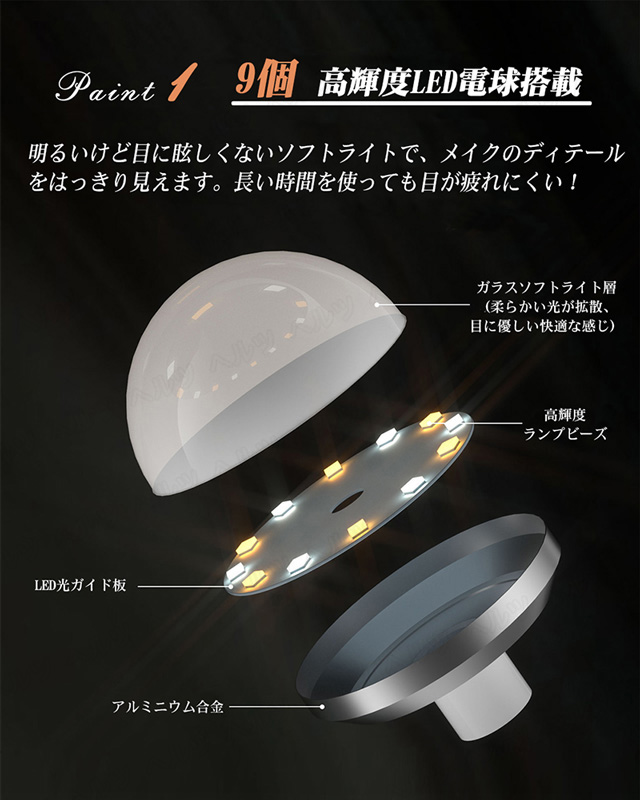 9個LED電球が搭載され、時間や場所を気にせず、美しいメイクををお楽しみいただけます。