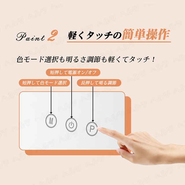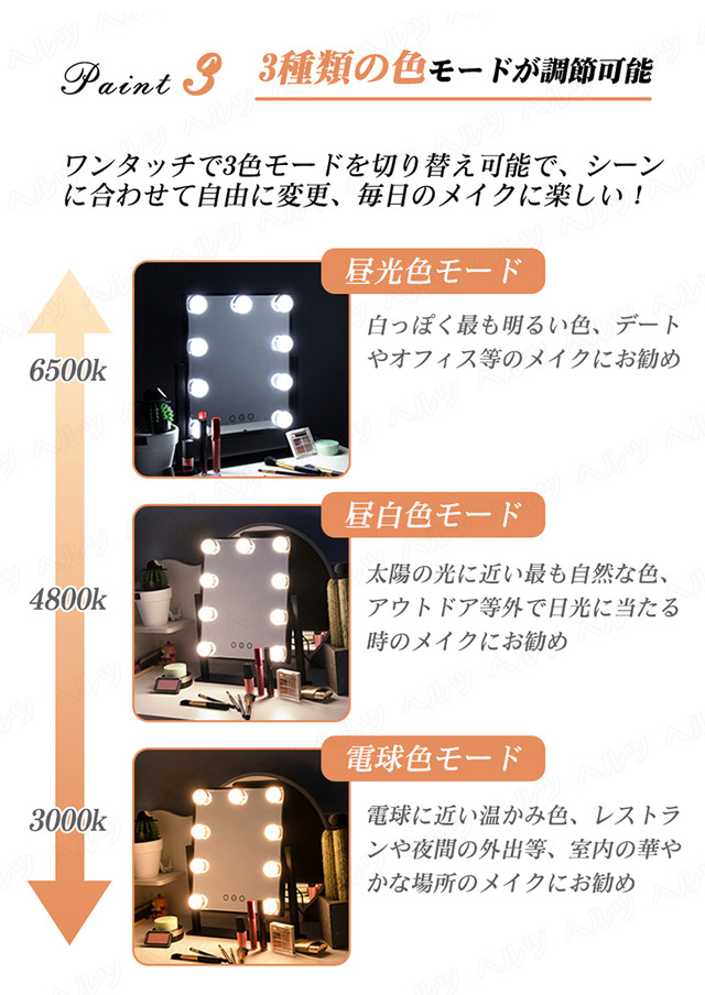 シーンに合わせて3色の光に切り替えができ、天気や部屋の照明の影響を受けずに、暗い場所や夜でも綺麗にメイクできます!