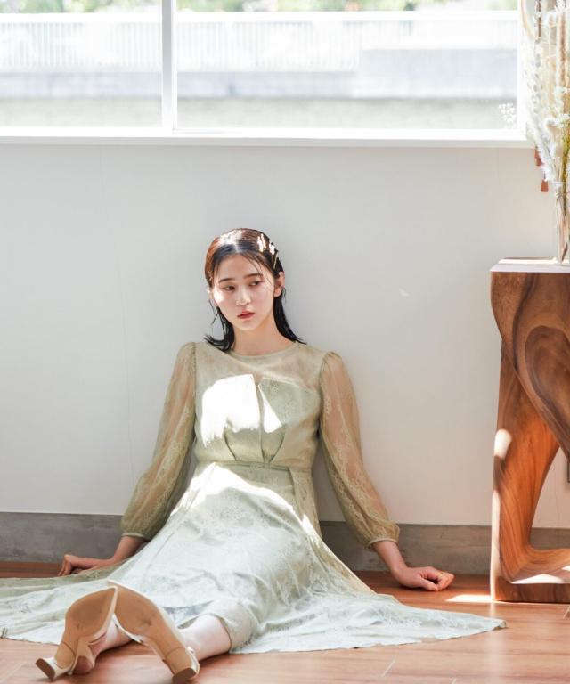 袖と足元、そしてデコルテは透けすぎない控えめなシアー感に。
