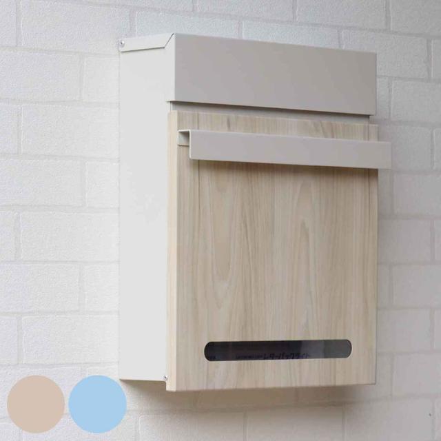 2色展開でくすんだベージュのグレージュと爽やかなスカイブルーのシンプルでナチュラルな壁掛けポストです。また、取り出し口の扉には相性の良いホワイト系の木目を採用しています。壁のデザインを選ばず合わせやすい壁掛けポストです。