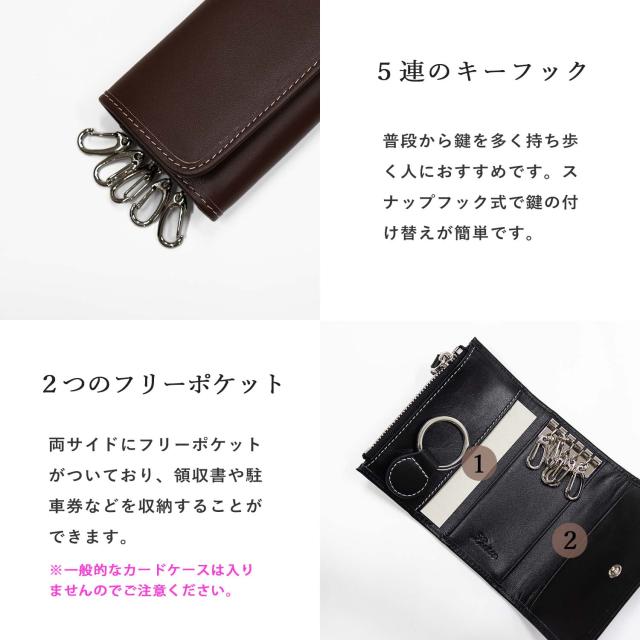 メインのキーフックは5連タイプ。開閉しやすいスナップフック式で鍵の付け替えもしやすいのが特徴。内部にはフリーポケットが2つあり、領収書や駐車券などの収納に最適。