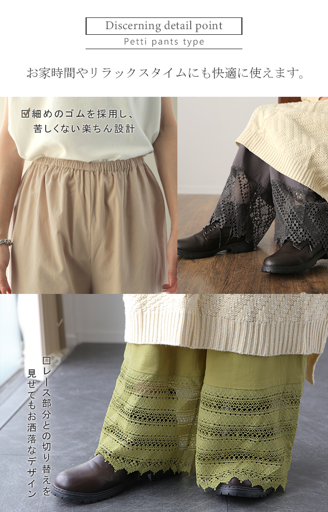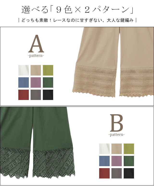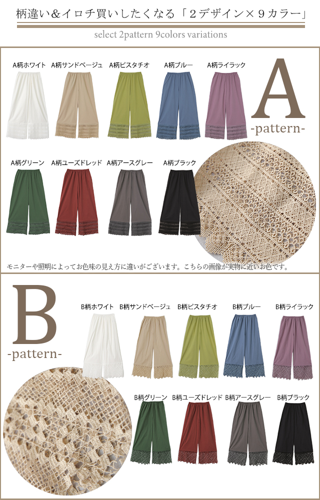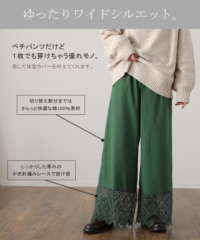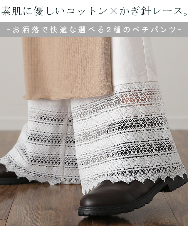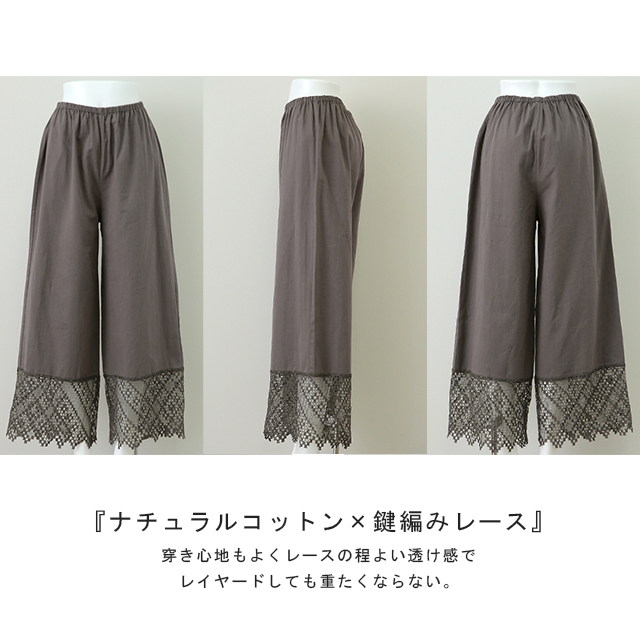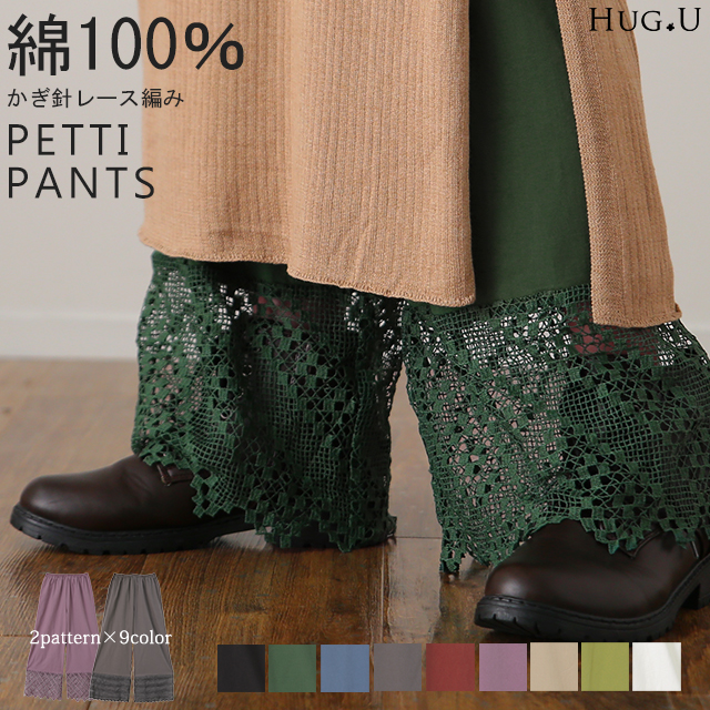 裾パンツ 「 カラー 9色」 綿100% ペチパンツ パンツ ズボン レディース カラーパンツ ペチコート ボトムス インナー レイヤード 重ね着 レース ロング 体型カバー ゴム ワイド グリーン 黒 大きいサイズ ワイドパンツ HUG.U 夏 秋新作
