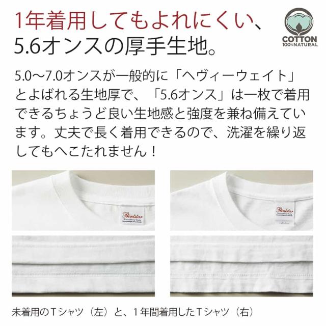 | Tシャツのメーカー | Printstar(プリントスター)…累計1.5億枚以上販売されているキングオブTシャツ。洗濯してもヨレがすくなく、タフなTシャツです。 |