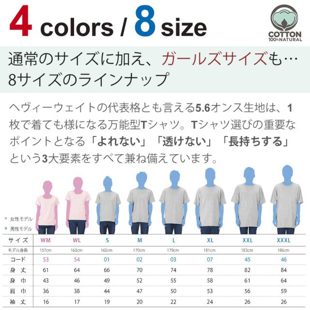 | 素 材 | ・半袖Tシャツ5.6oz ・綿(コットン)100%(※杢グレーは綿80%、ポリエステル20%) ・黒のTシャツのみ、商品の出荷時はプリント時に使用した糊が付着しております(印刷面の周りなど)。一度洗濯してからご着用下さいませ(何度か洗っているうちに糊は取れます)。 |